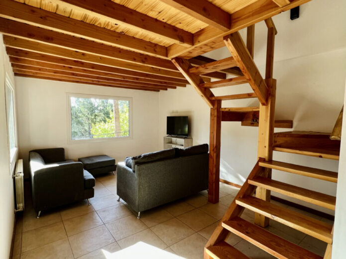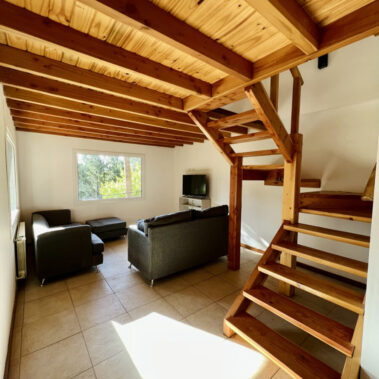 IMPORTANTE: Se accede a la cabaña por medio de una rampa muy bien iluminada y empinada que lo deja directamente en el estacionamiento de la propiedad que cuenta con lugar amplio para dejar su vehículo. Una vez allí deben subir unas escaleras para llegar.