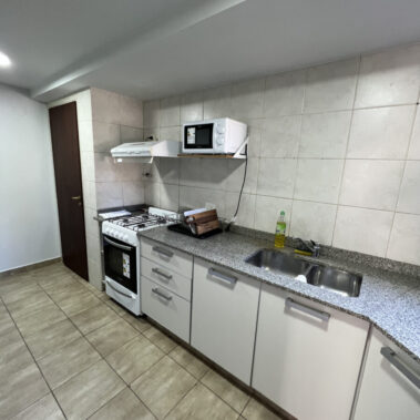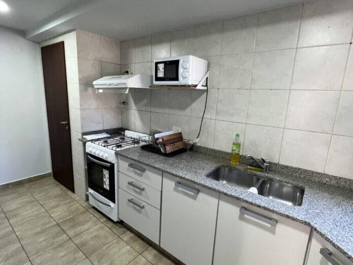La cocina es ideal para poder cocinar durante su estadía, cuenta con heladera, horno a gas y microondas.