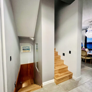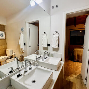 En la planta alta se encuentra la habitación principal con cama matrimonial, baño completo e hidromasaje. La segunda habitación posee dos camas individuales y comparte un baño completo con la tercera habitación que tiene una cama matrimonial.